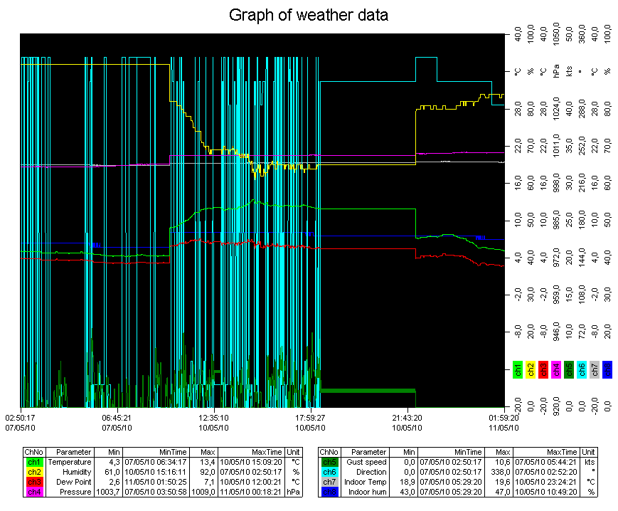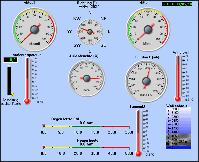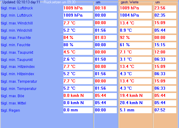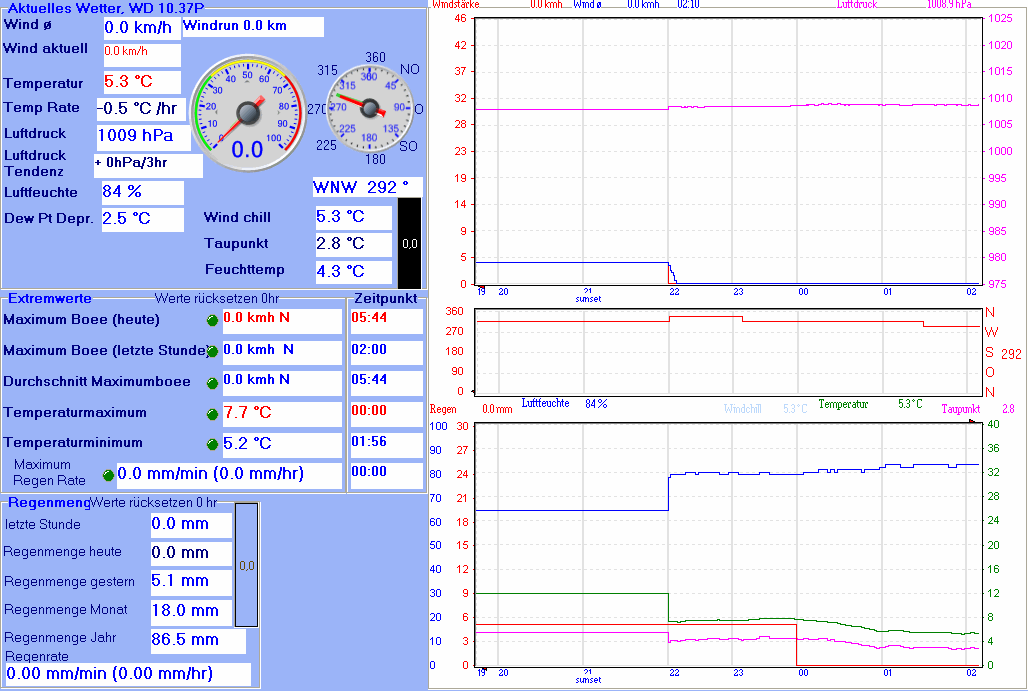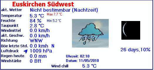| Windchill Temperatur | 5.3°C | Windspitzen (letzte Std) | 0.0 kmh (0.0 kts) um: 02:00 |