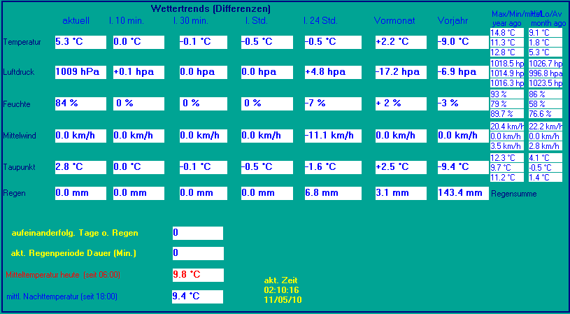 | Luftdrucktendenz | 0 hPa (letzte Std) | Trend (letzte 1 Std) | gleichbleibend |
